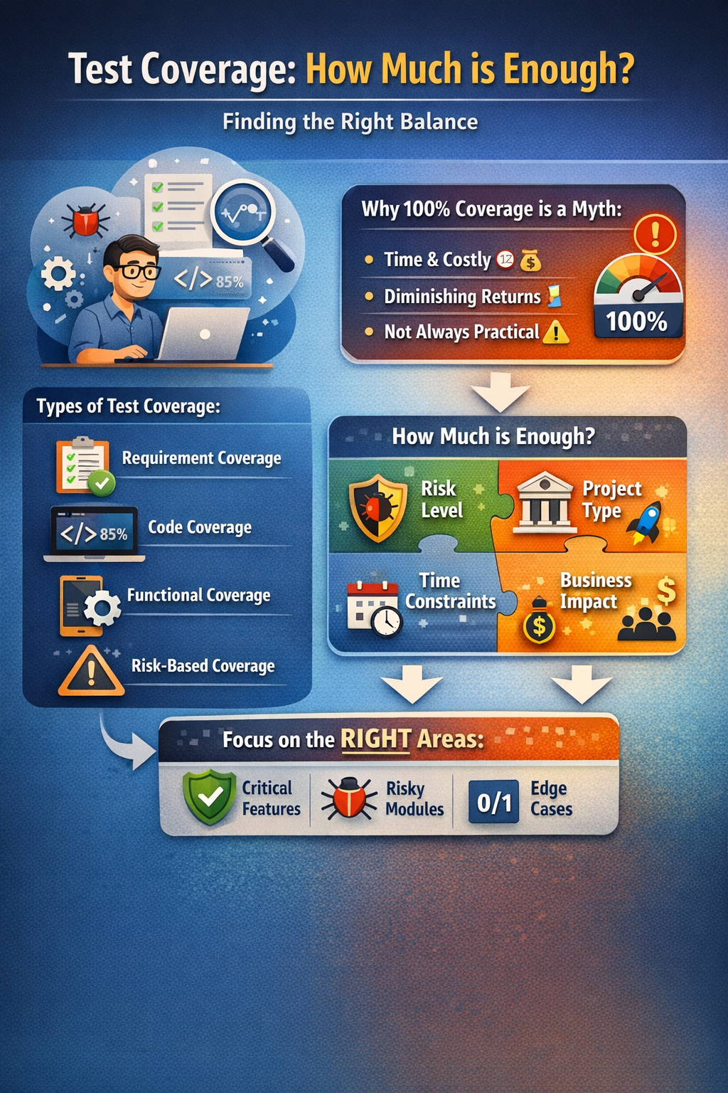 While achieving 100% test coverage sounds ideal, rarely practical. The goal of a QA engineer is not to test everything, but to test smartly